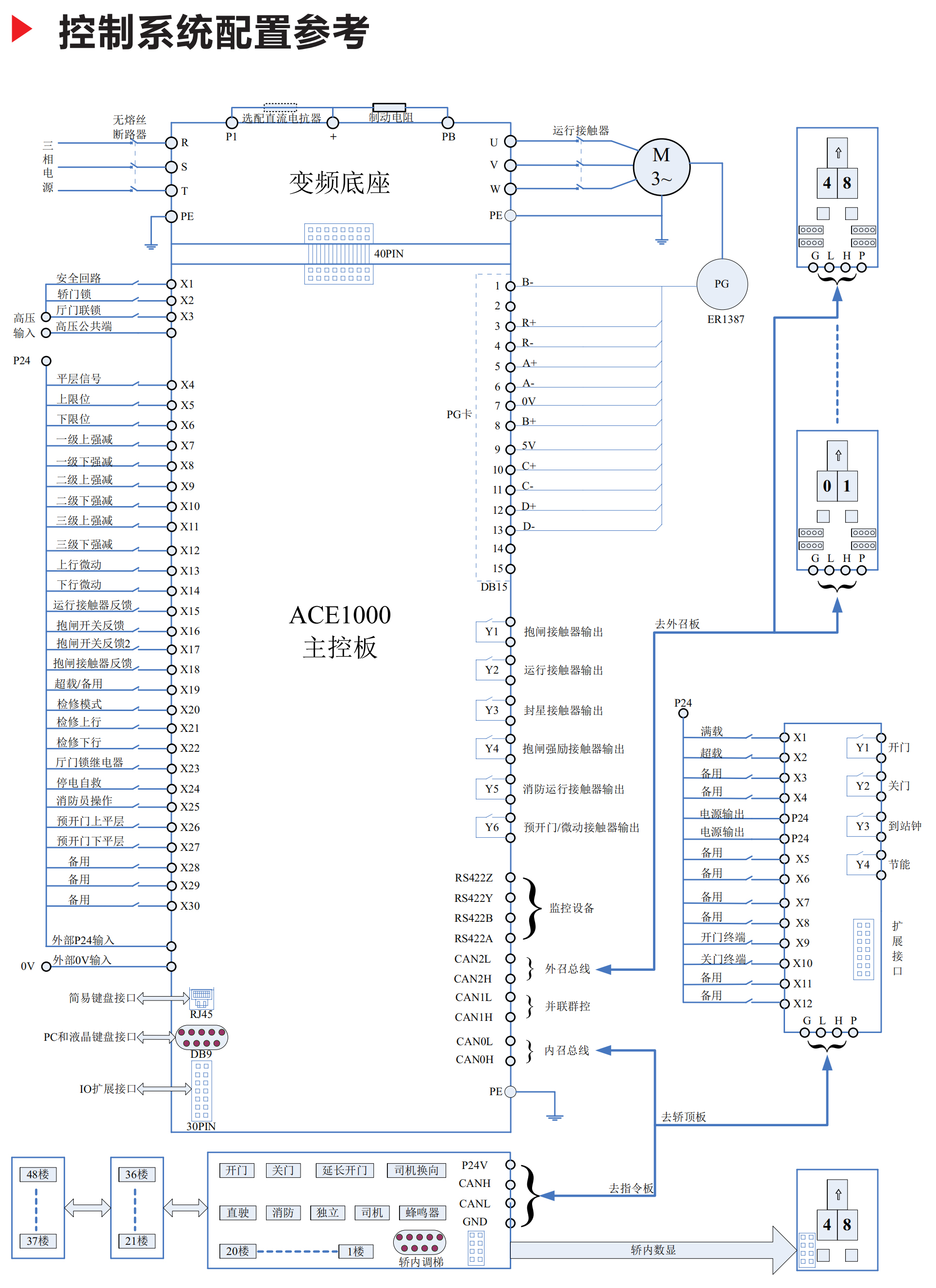 ACE1000電梯一體化控制系統(tǒng),它包含一體化主控板(含多種PG卡、IO擴(kuò)展板)、1.1KW~45KW變頻底座、轎頂控制板(含擴(kuò)展板)、轎內(nèi)指令板(含擴(kuò)展板)、多種轎內(nèi)數(shù)顯板及廣告機(jī)、多種廳外召喚板、轎內(nèi)語音板、簡易鍵盤、中文液晶鍵盤、UCMP板、PC配套軟件、手機(jī)配套軟件等一整套完善的電梯控制系統(tǒng)解決方案。
